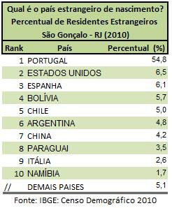 Percentualmente, há mais Americanos, Chilenos, Chineses e Namibianos em São Gonçalo do que em outros municípios do Estado do Rio de Janeiro e, também, no Brasil.